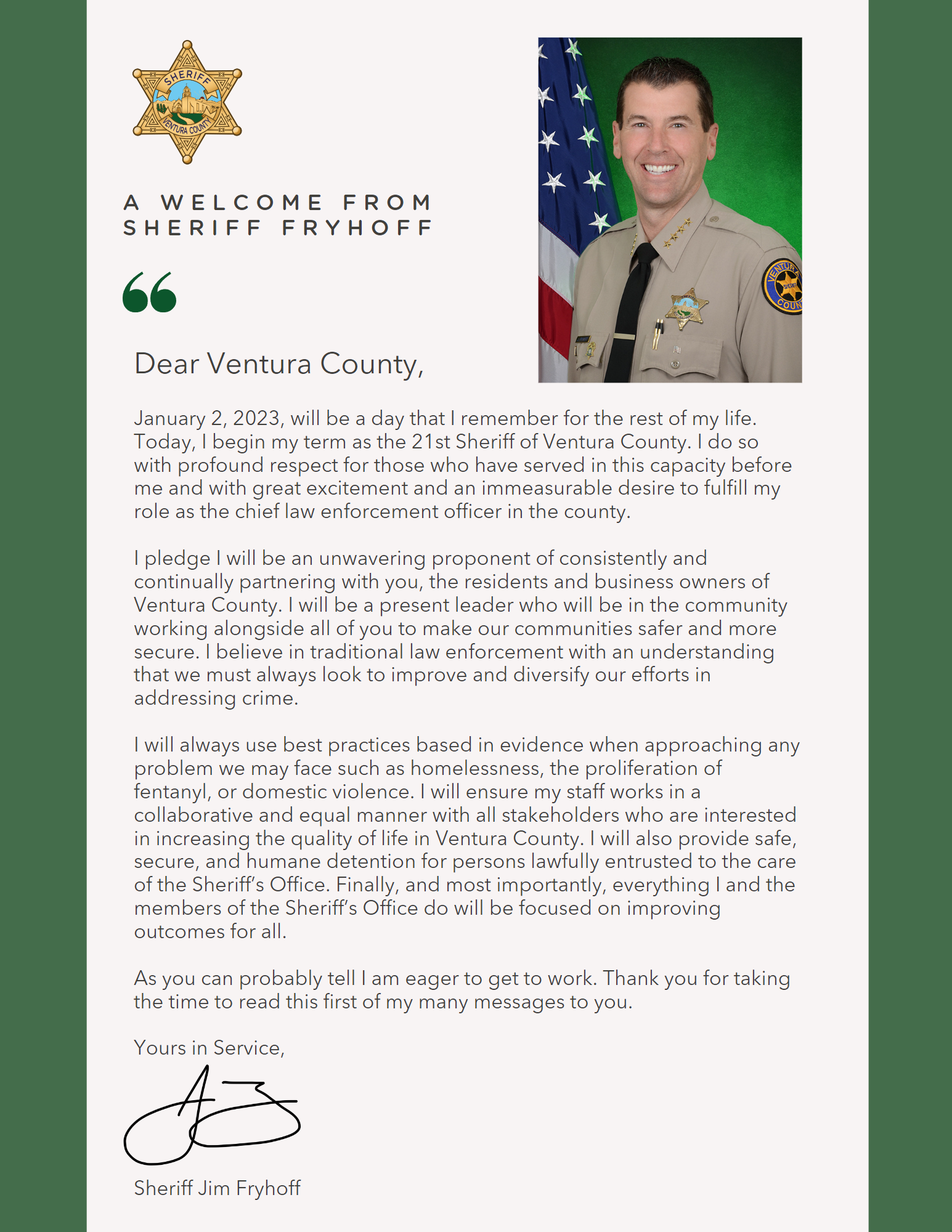 Sheriff James “Jim” Fryhoff grew up in Pasadena, California. Jim was a police cadet with the Pasadena Police Department prior to moving to Ventura County. Jim relocated to Ventura County when he joined the Ventura County Sheriff’s Office in 1990.